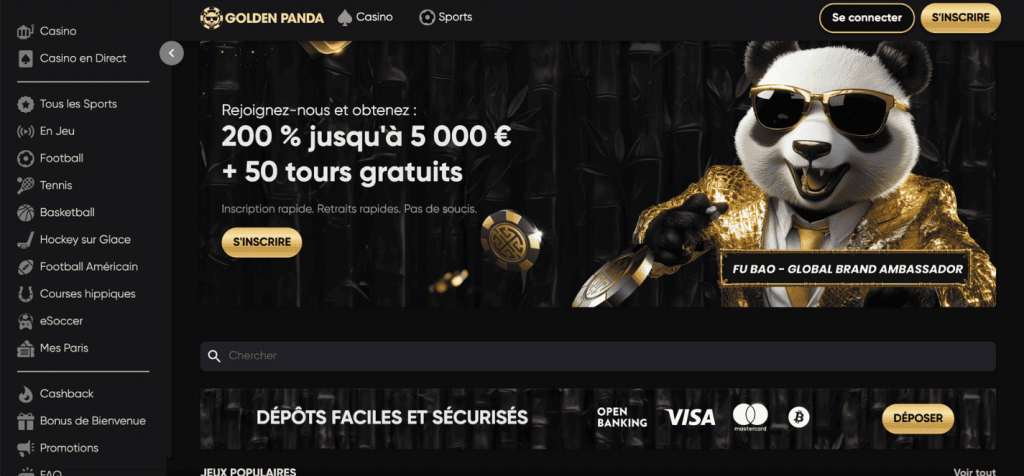 Golden Panda Casino est une plateforme de jeu en ligne relativement récente, lancée en 2024, qui se distingue par son design élégant aux tons noir et or et son ambassadeur virtuel Fu Bao, le panda porte-bonheur, affichant une ambiance résolument inspirée des traditions asiatiques. Le casino est exploité par la société EOD Code SRL, enregistrée au Costa Rica, et opère sous licence de la Curaçao Gaming Control Board. La plateforme est protégée par un chiffrement SSL et propose un accès aussi bien en devises fiat qu’en cryptomonnaies, avec plus de 3 000 jeux et un sportsbook intégré couvrant plus de 60 marchés sportifs.