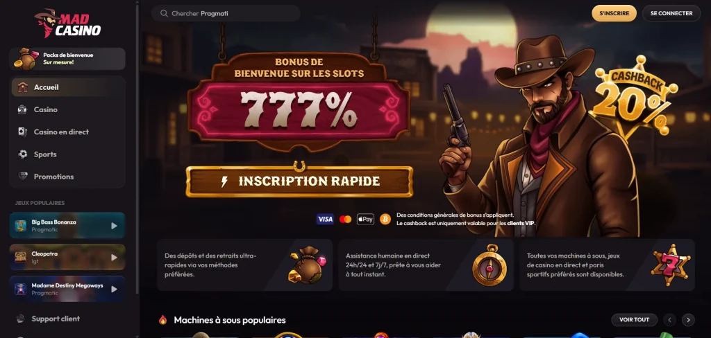 Mad Casino a ouvert ses portes en mars 2025 et détient une licence de jeu valide délivrée par l’Anjouan iGaming, se positionnant d’emblée comme une plateforme hybride proposant à la fois des jeux de casino et des paris sportifs pour des joueurs du monde entier. Malgré sa très jeune existence, le casino a rapidement gagné en popularité grâce à une bibliothèque de plus de 3 000 jeux, un programme VIP attractif et une gamme étendue de méthodes de paiement, incluant les cryptomonnaies. Le site est disponible en français ainsi que dans de nombreuses autres langues, ce qui en fait une option accessible pour les joueurs francophones.